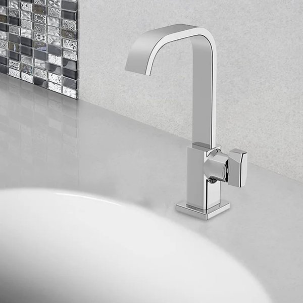 Projetada para instalação sobre a mesa do lavatório, a torneira oferece acionamento prático e preciso, garantindo controle eficiente do fluxo de água. Sua ergonomia proporciona conforto durante o uso diário, tornando as tarefas rotineiras mais agradáveis e funcionais.